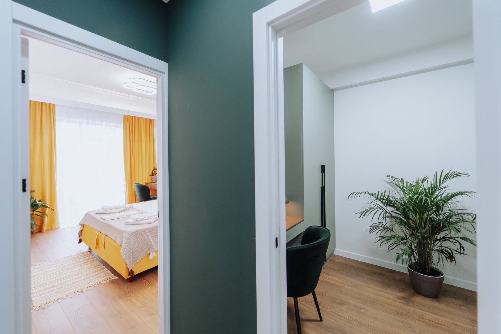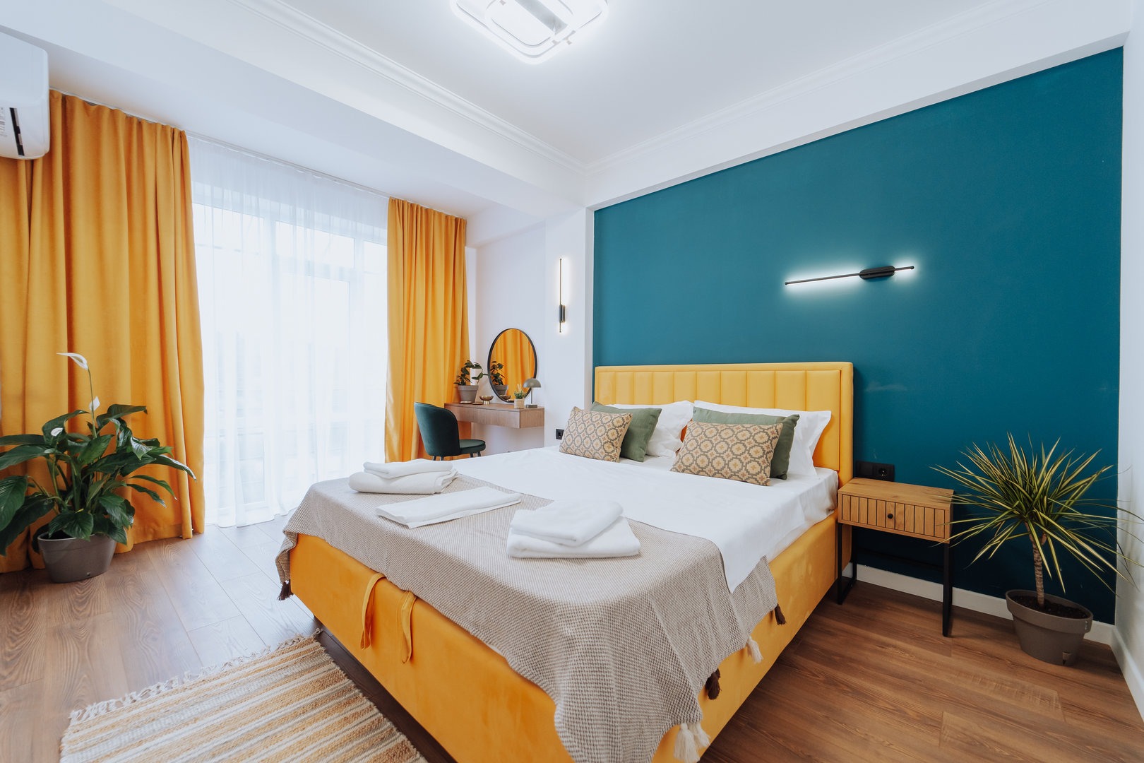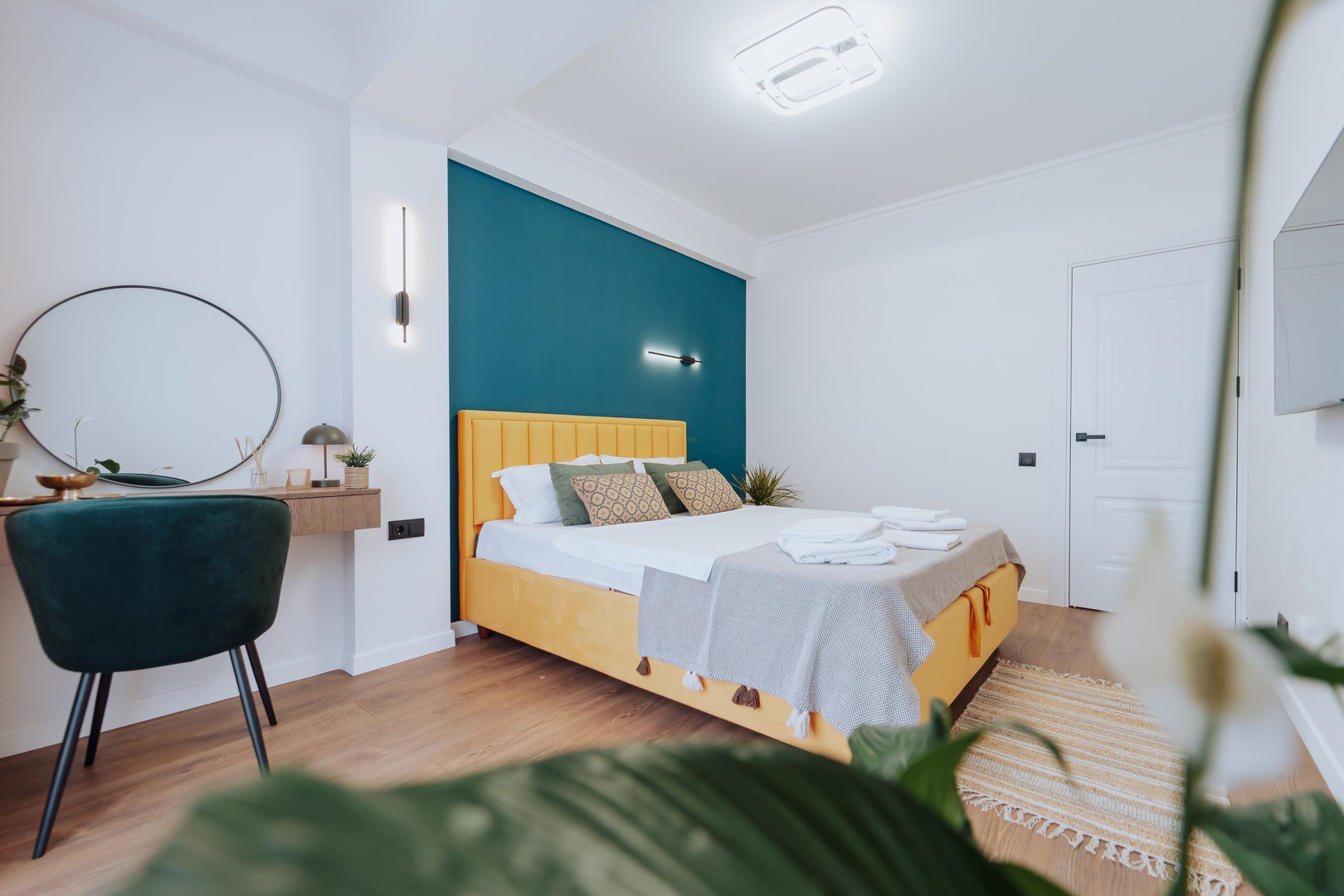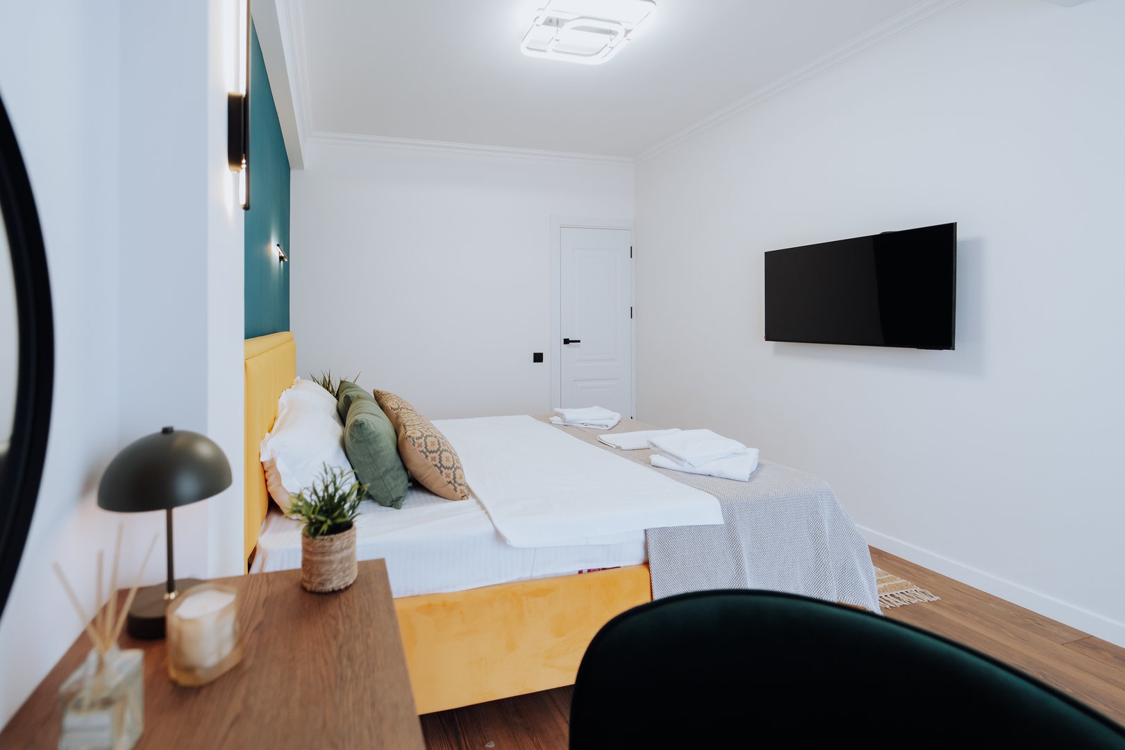 Сozy, renovated 1-bedroom apartment in quiet Râșcani, Chișinău. Located on the 11th floor in a new building, with city views, a French balcony with beautiful view, and stylish yellow, blue, and green accents. Features a workspace, air conditioning, washer, and dishwasher. Perfect for relaxation or work, close to transport and amenities. Full access to the entire space. Ideal for a comfortable and peaceful stay. We are kids and pets friendly.